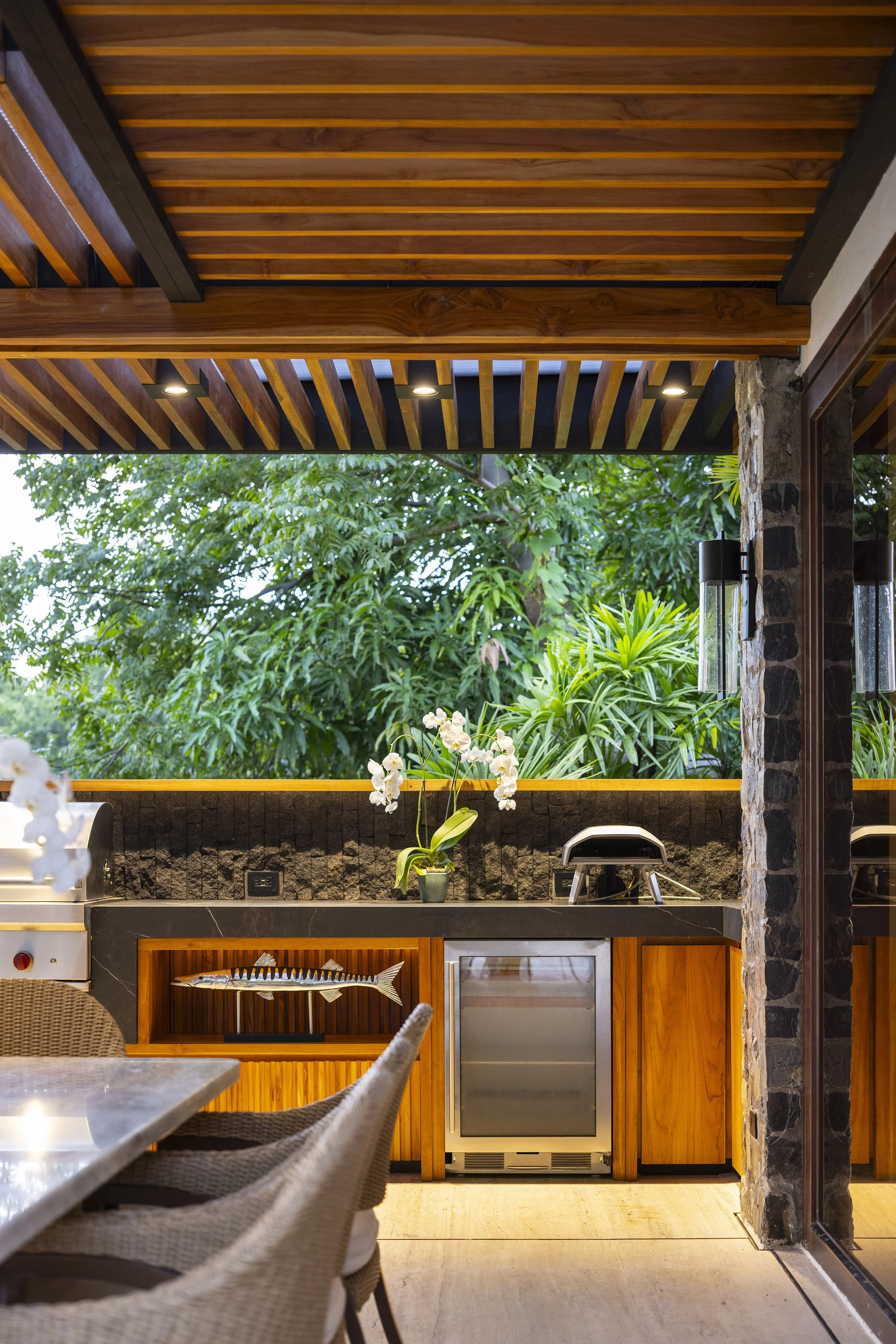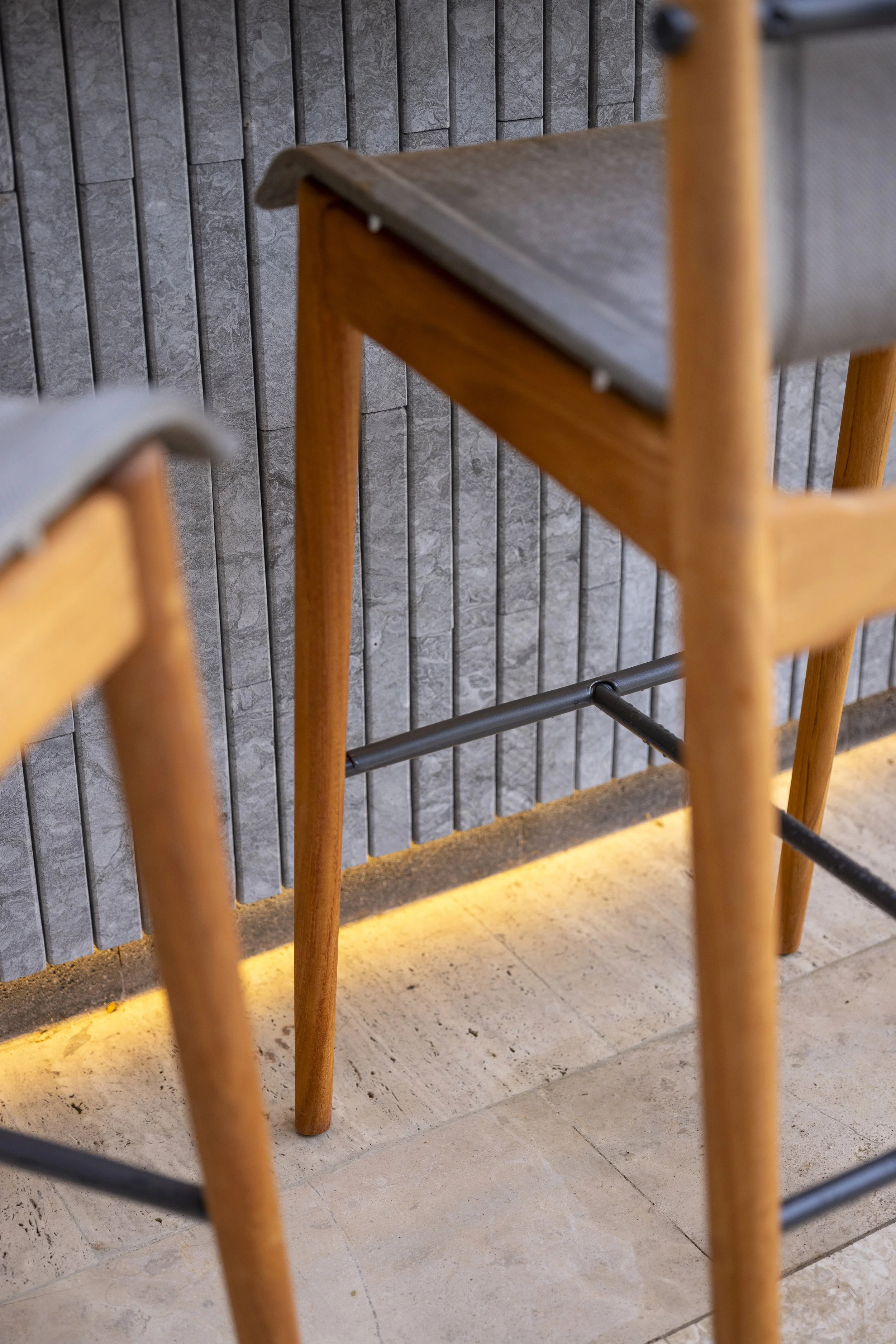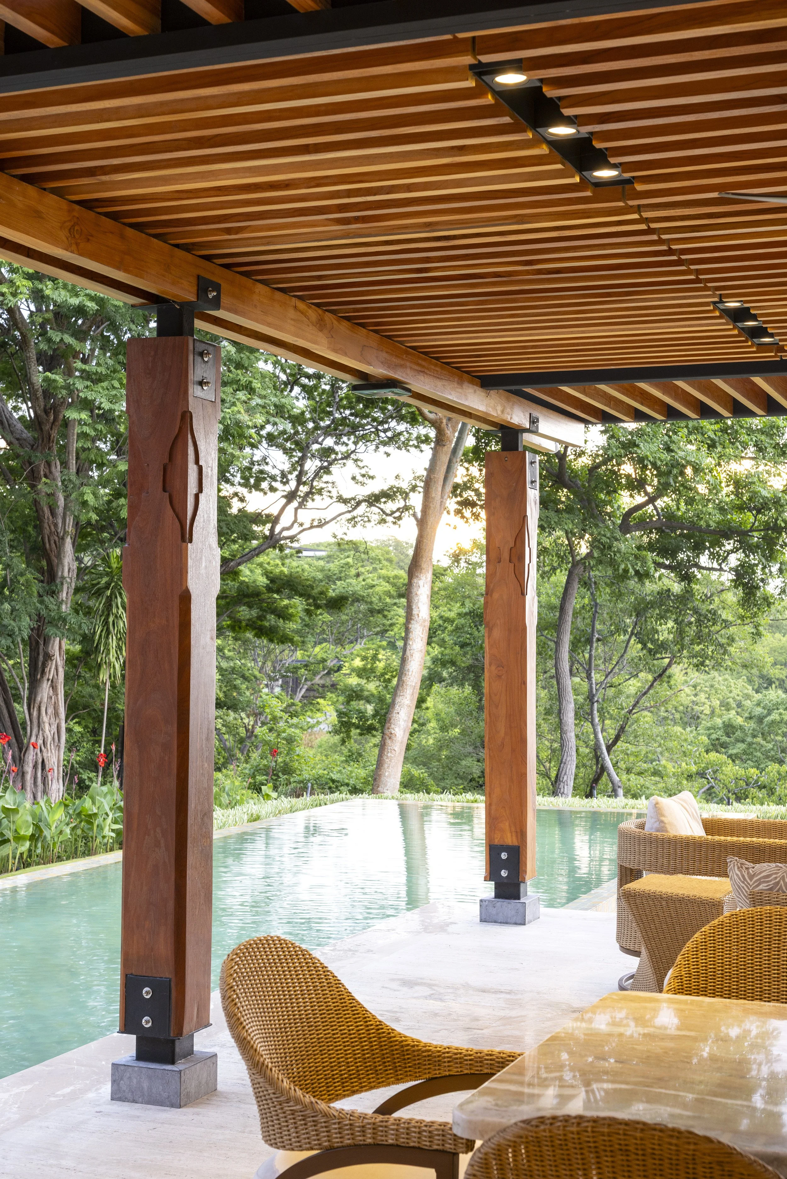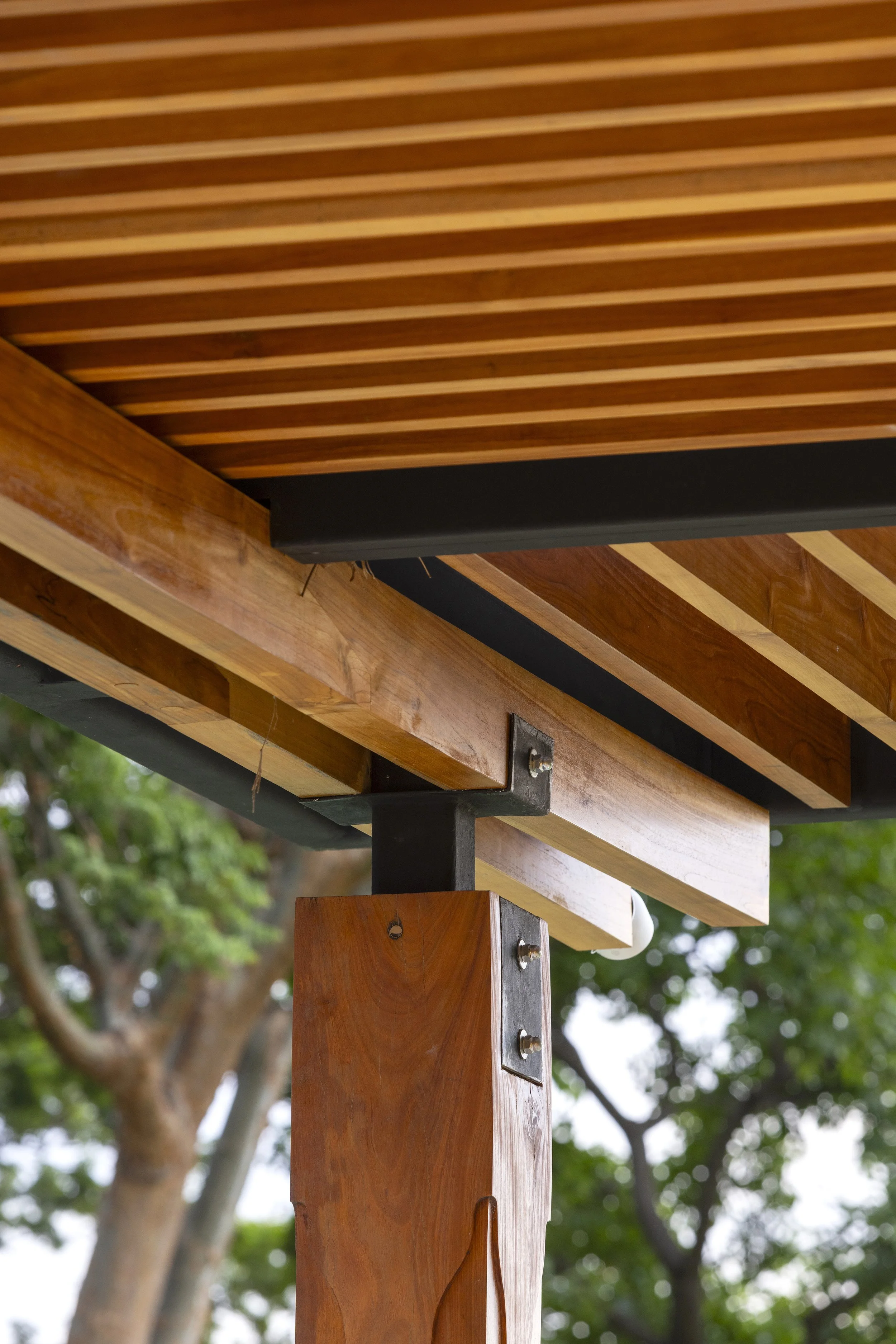To preserve the original columns, new raised concrete plinths were built and clad in lava stone, preventing water from pooling at the base. Custom metal connectors were then designed to rise from the plinths and embrace the wooden columns, creating a deliberate separation between elements. This solution not only protects the wood but also introduces a subtle sense of lightness to the structure.
