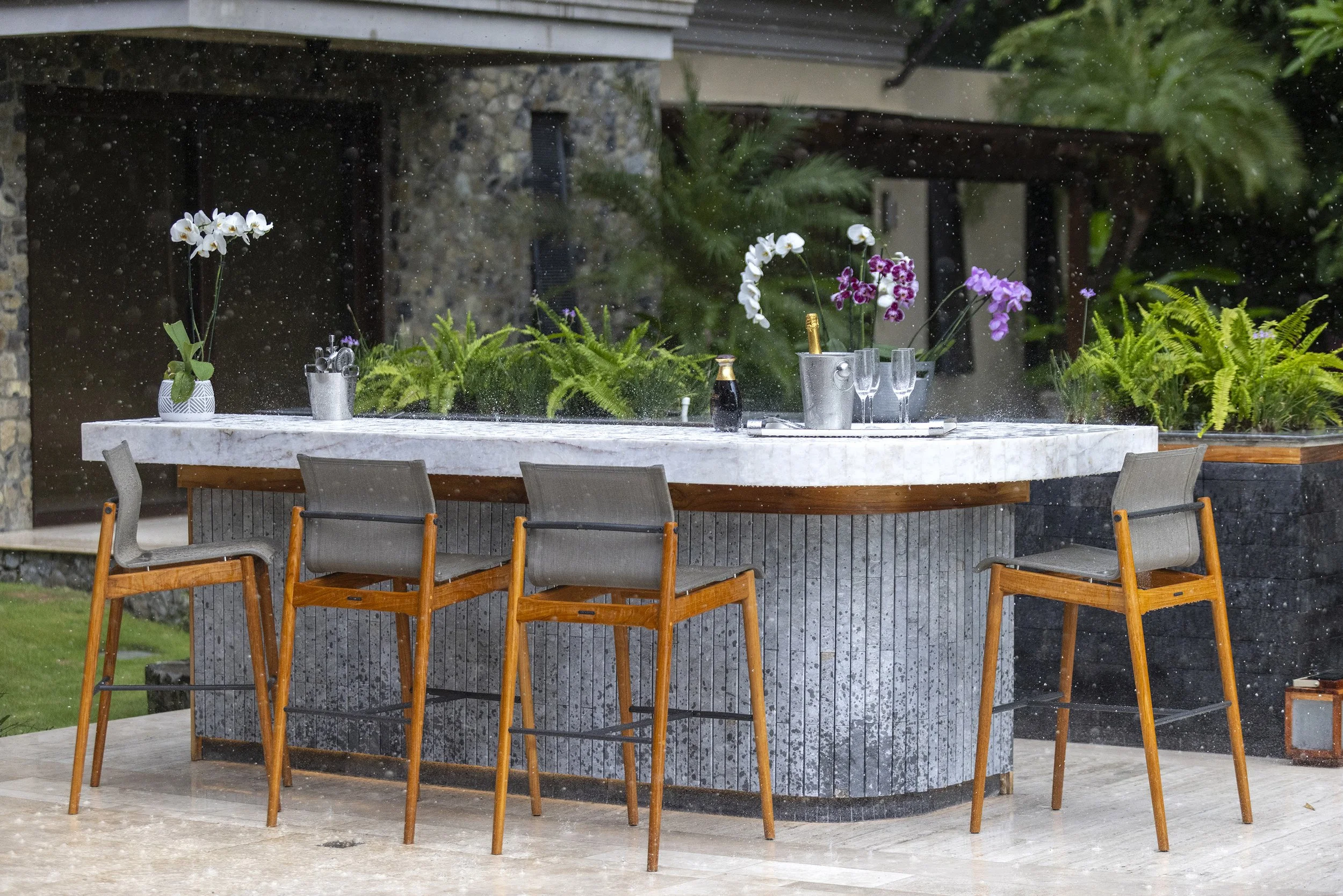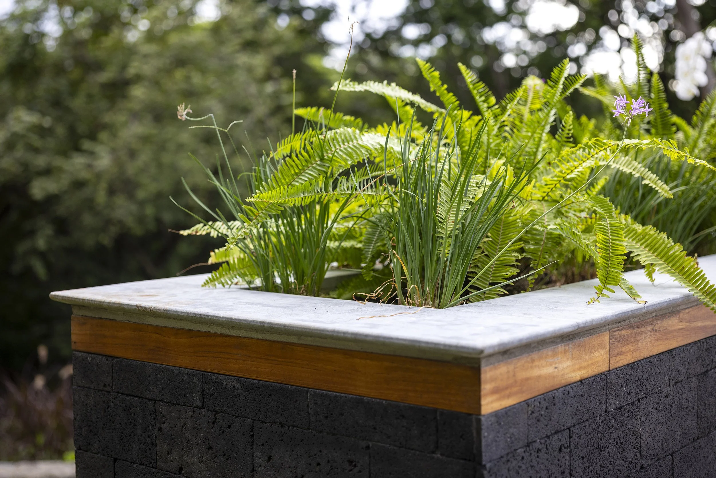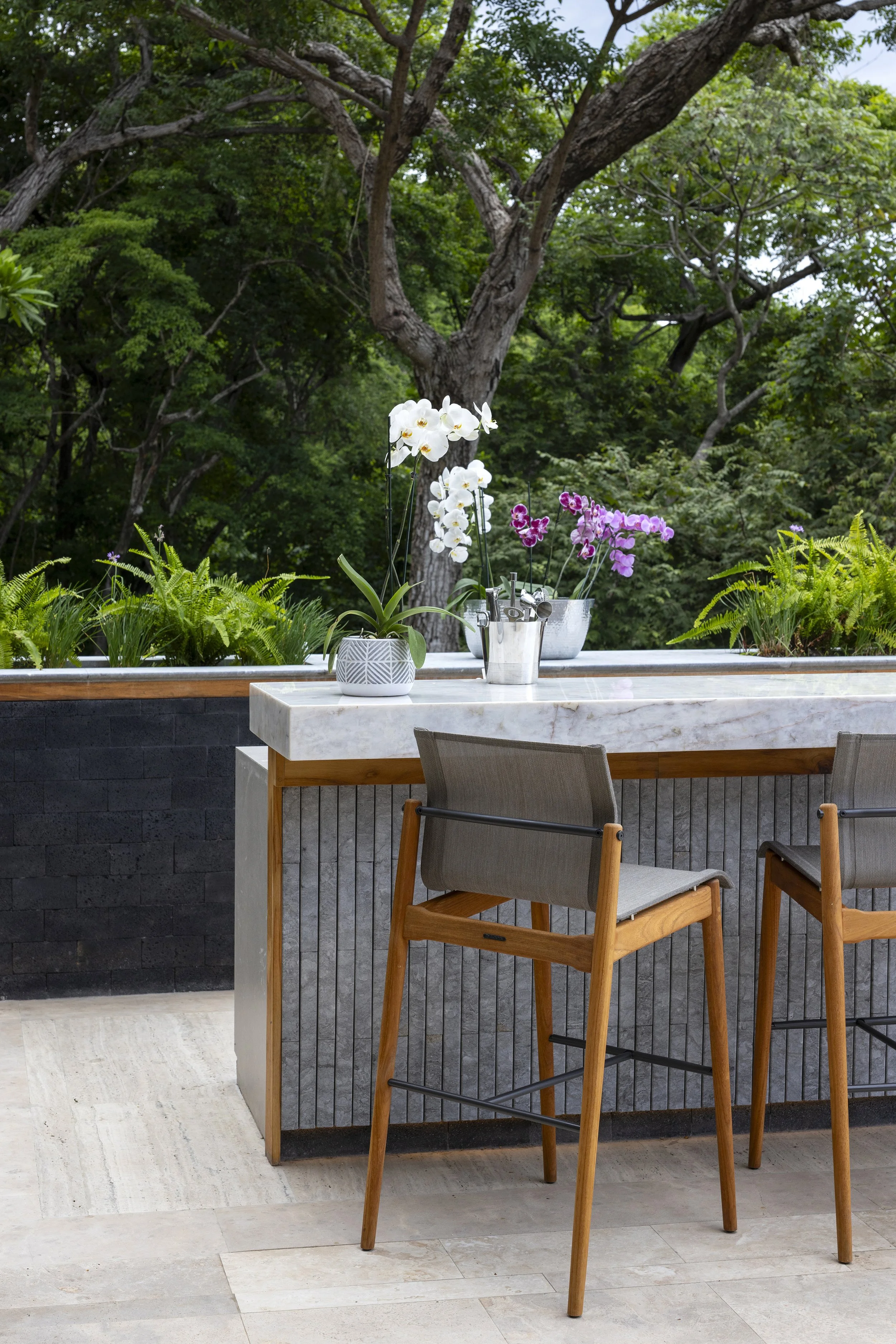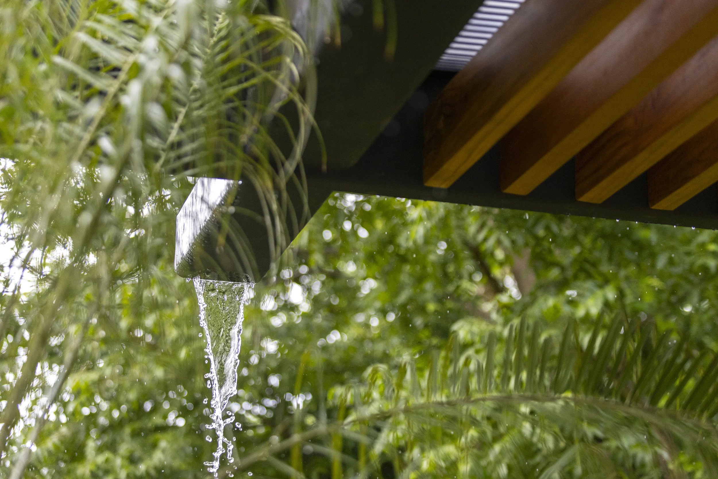 To preserve the original columns, new raised concrete plinths were built and clad in lava stone, preventing water from pooling at the base. Custom metal connectors were then designed to rise from the plinths and embrace the wooden columns, creating a deliberate separation between elements. This solution not only protects the wood but also introduces a subtle sense of lightness to the structure.