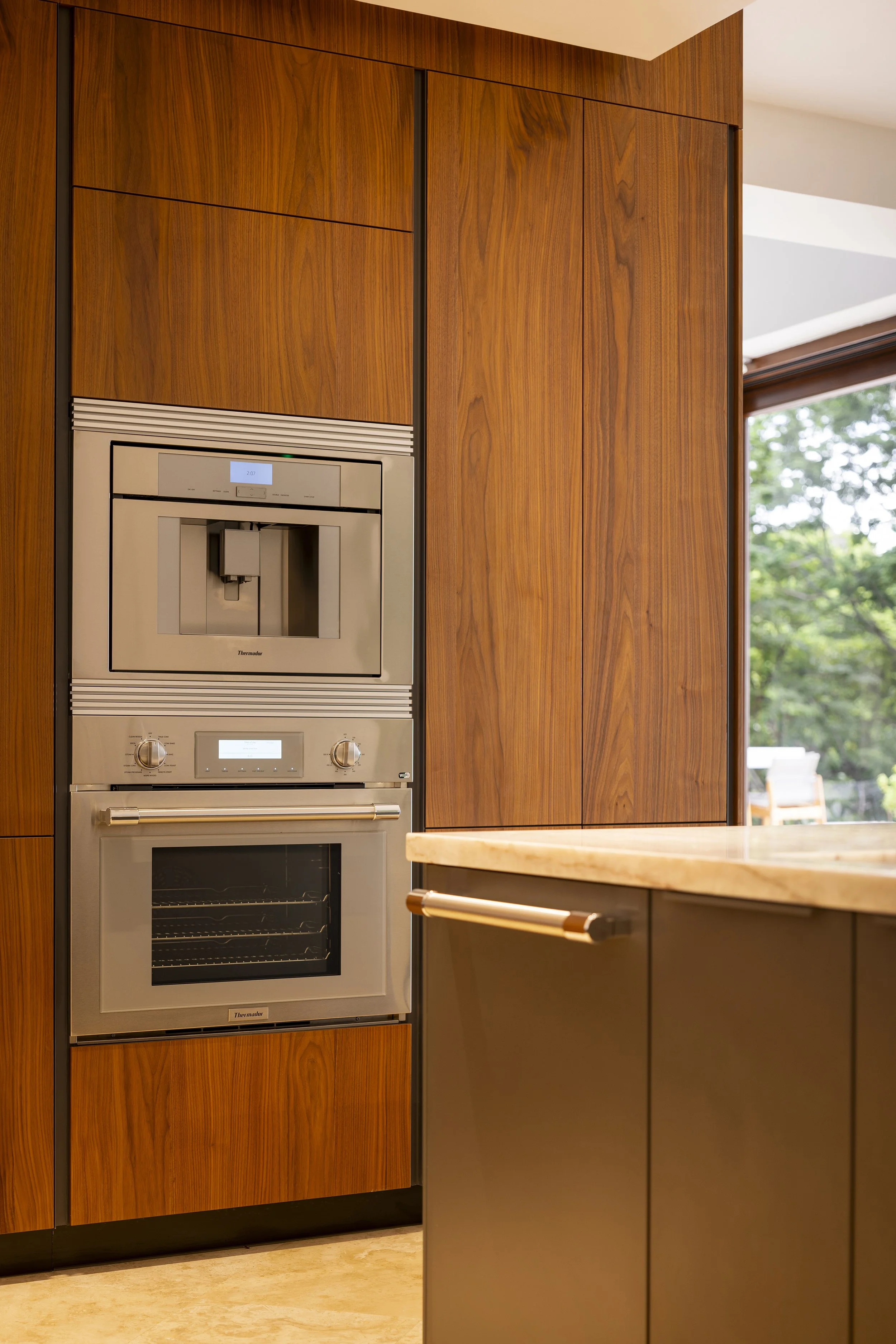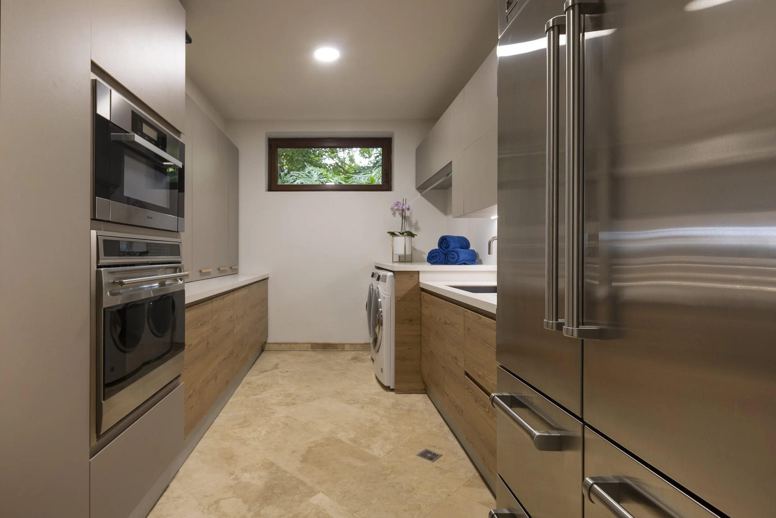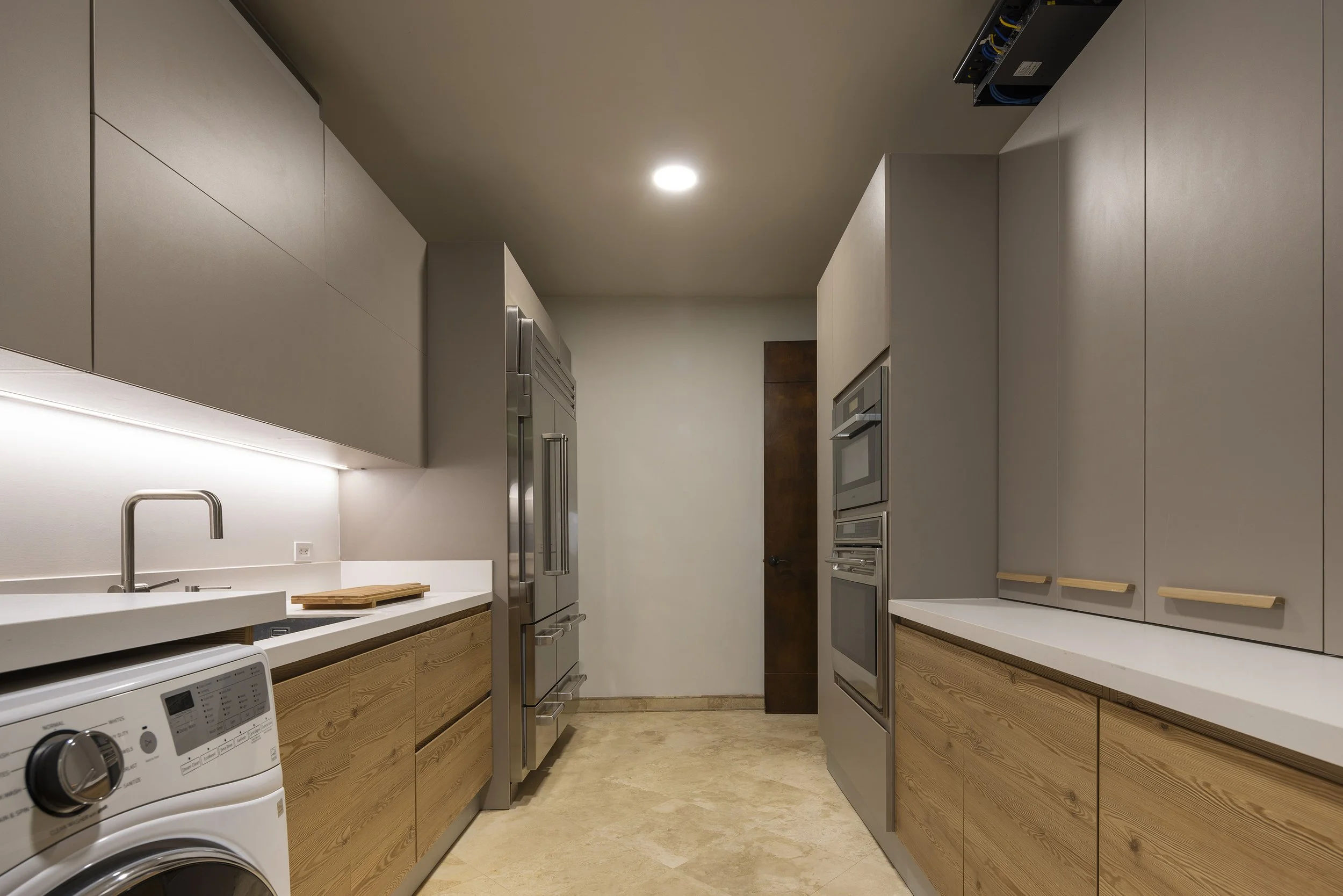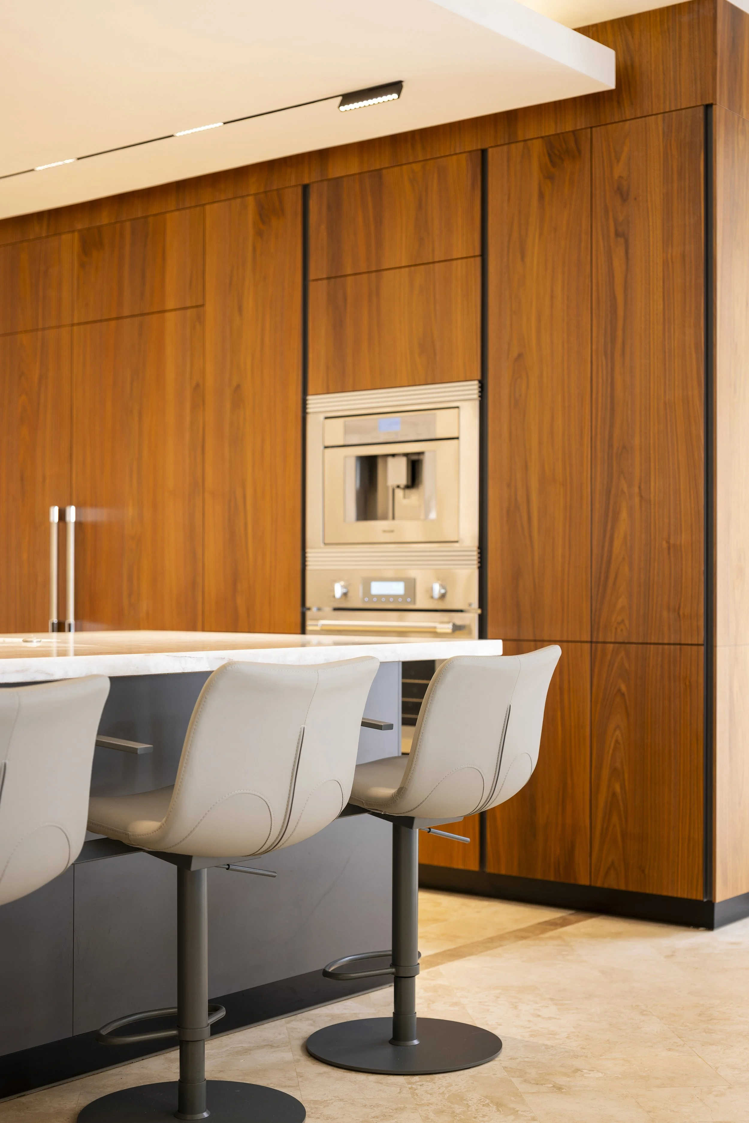 At the same time, the atmosphere shifts toward a lighter, more open character, allowing new interactions to unfold. Core kitchen functions are concentrated along one wall with integrated appliances and storage, freeing the opposite wall from cabinets.