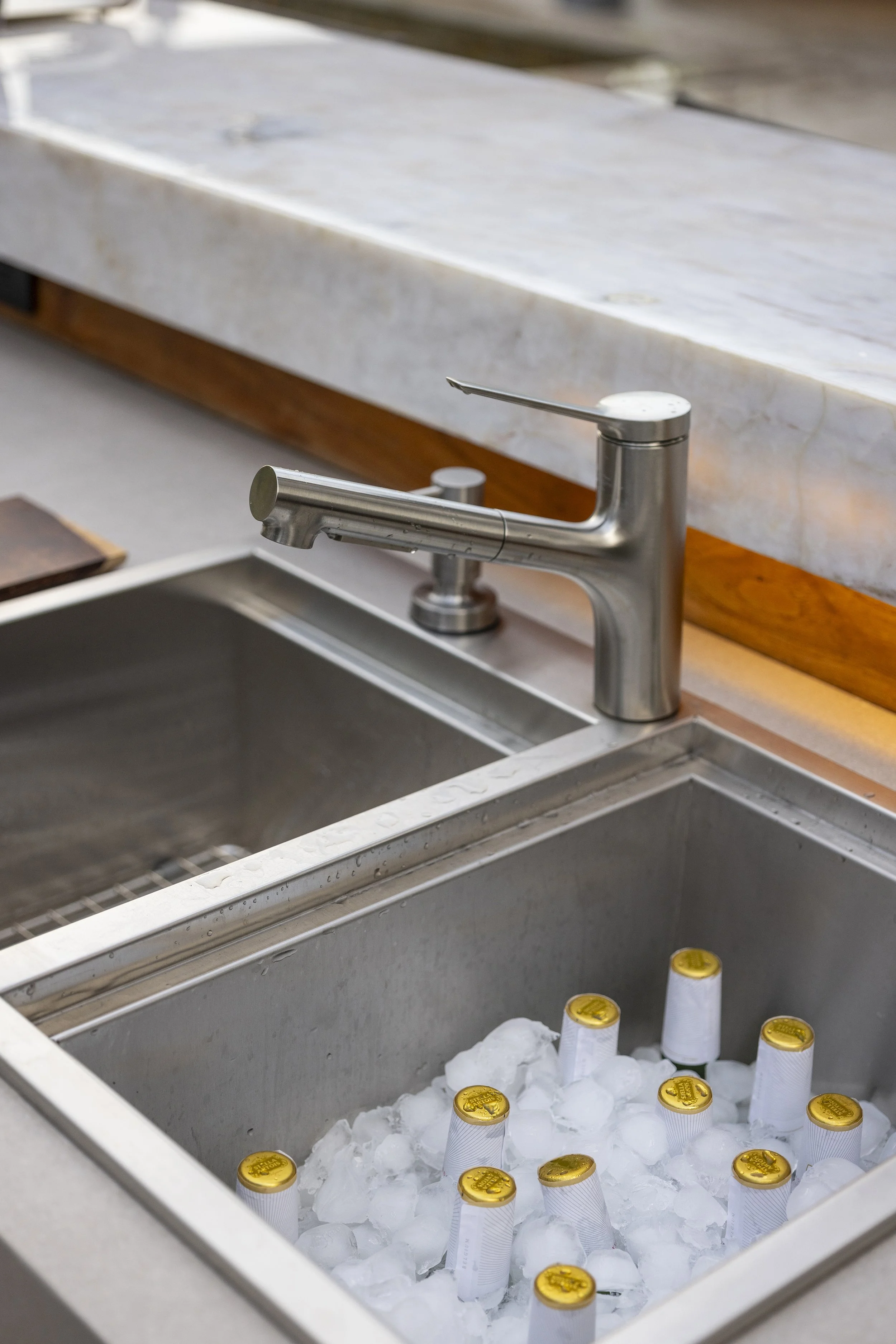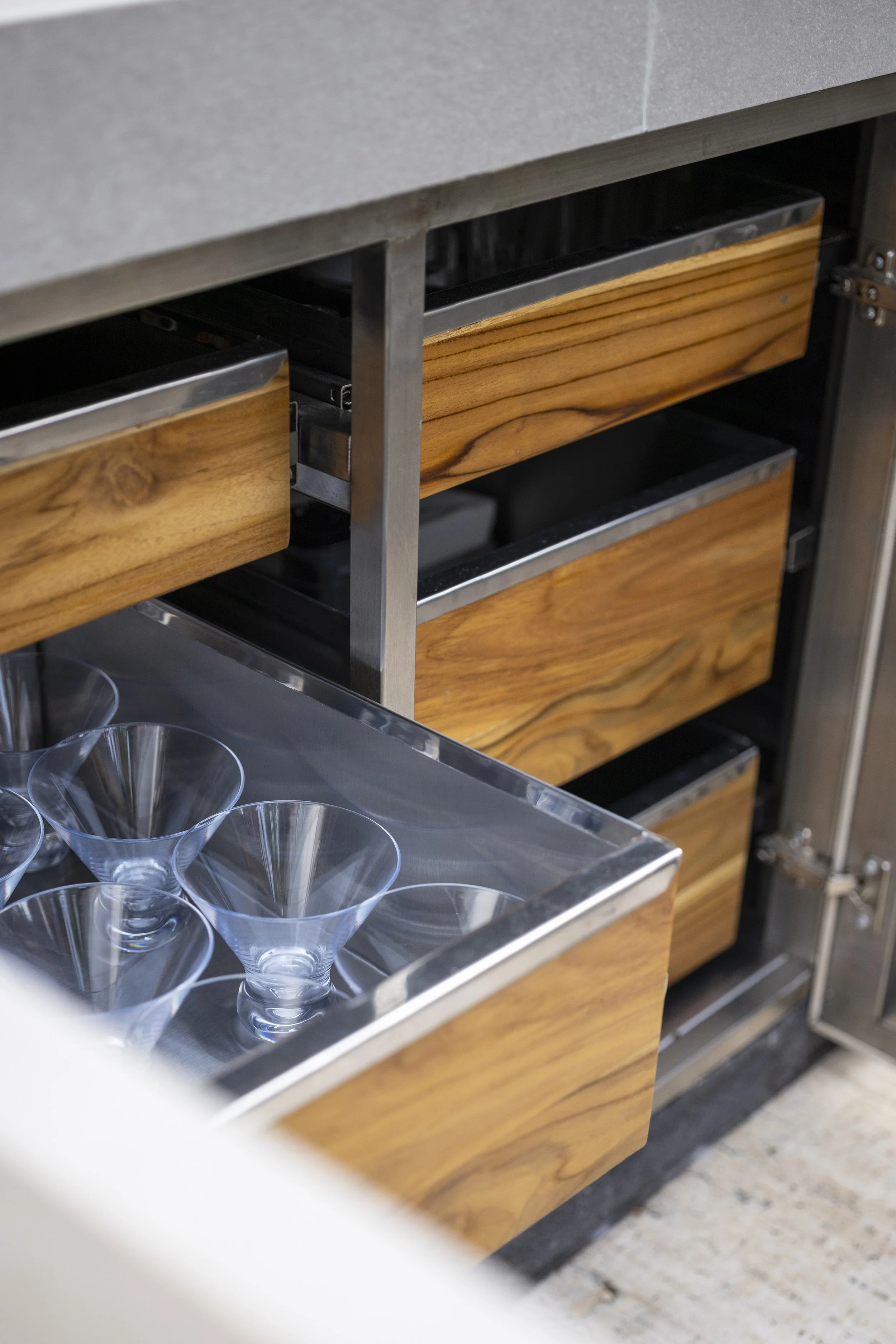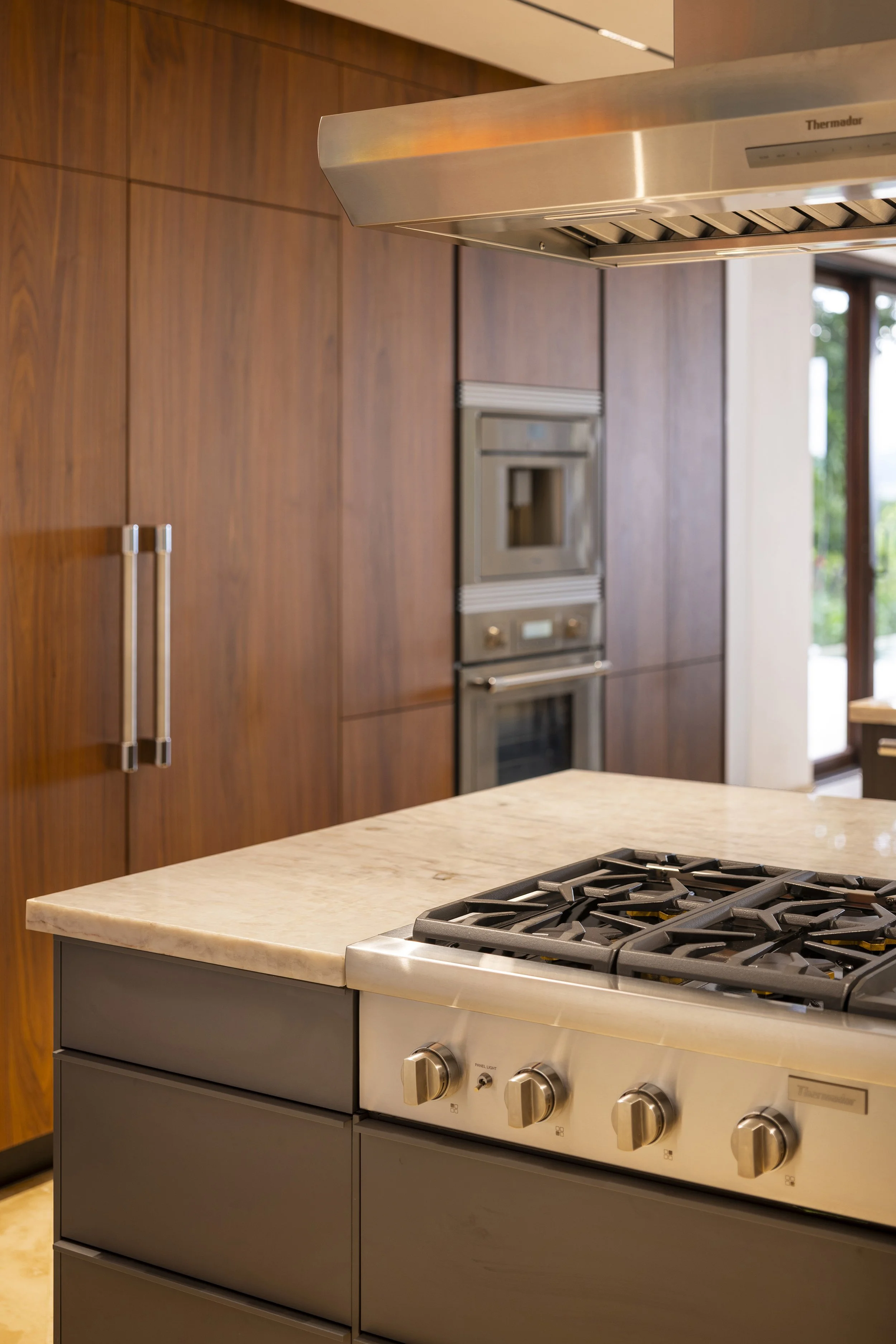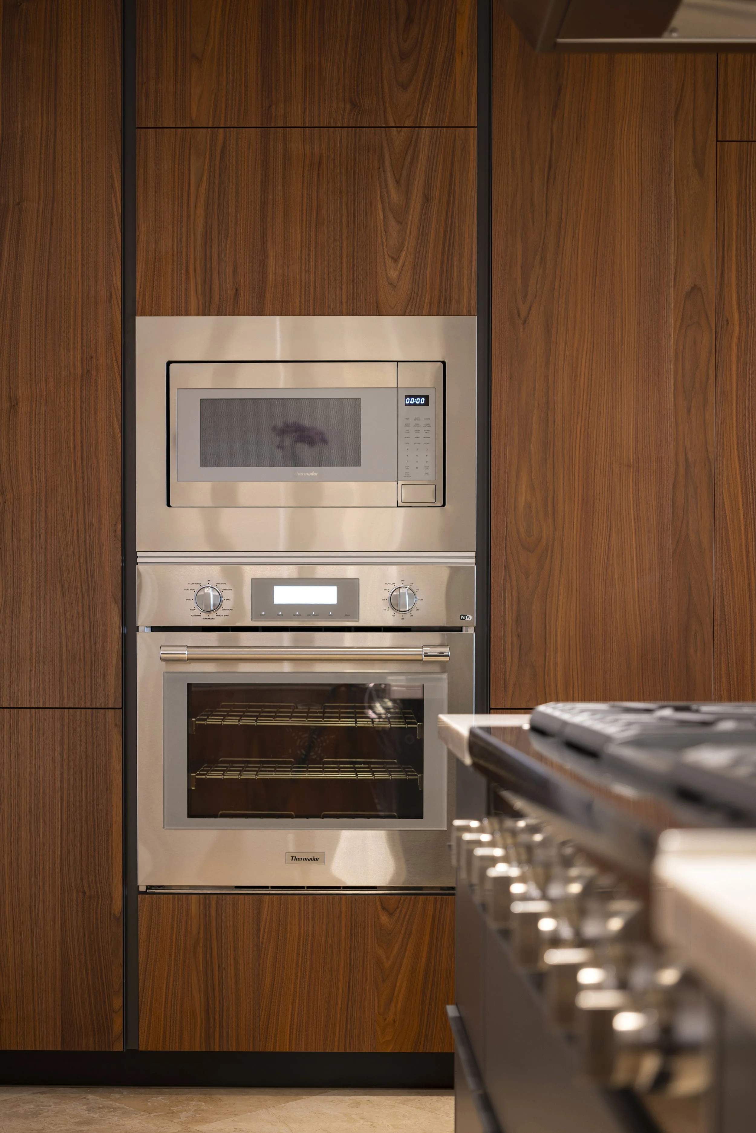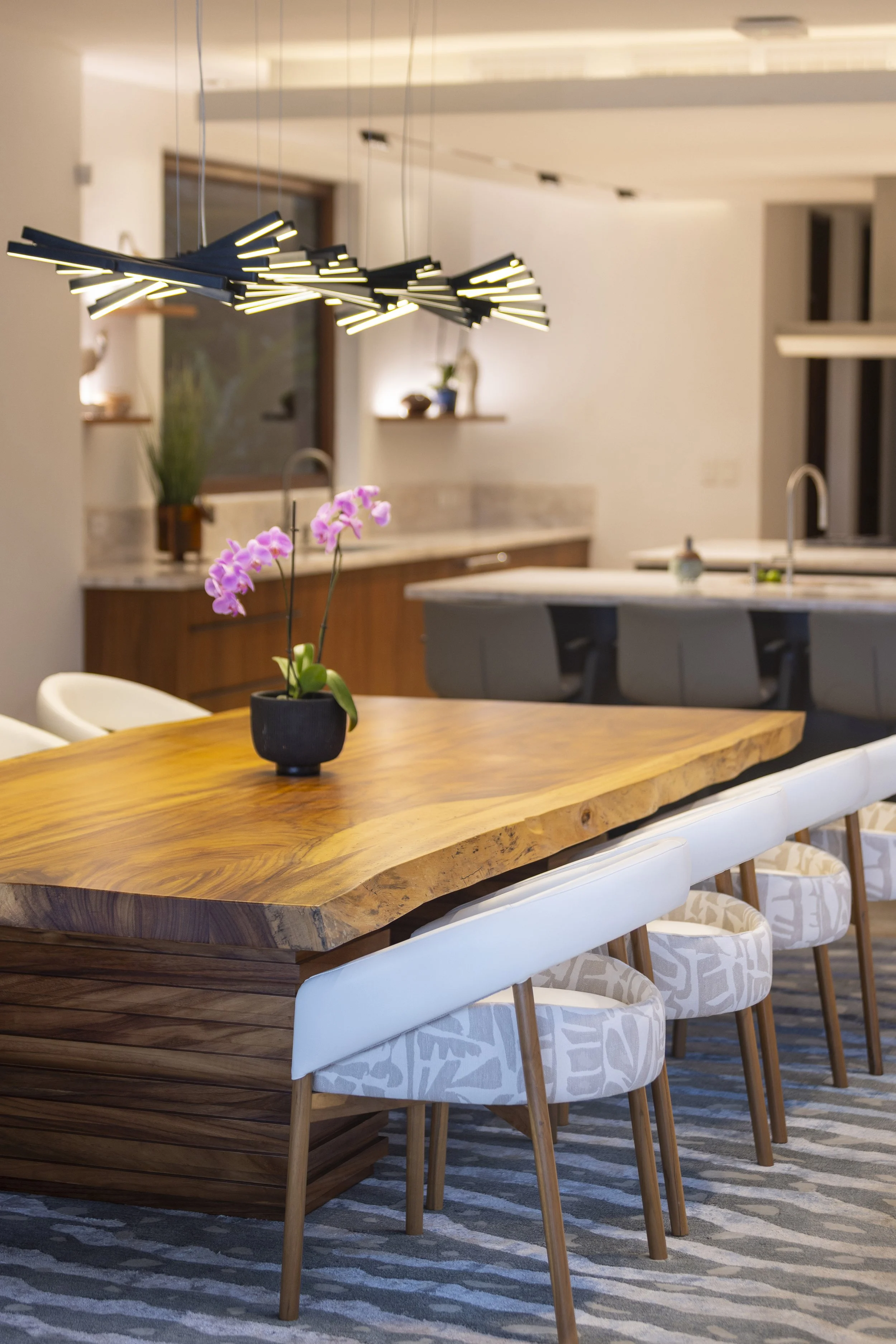 At the same time, the atmosphere shifts toward a lighter, more open character, allowing new interactions to unfold. Core kitchen functions are concentrated along one wall with integrated appliances and storage, freeing the opposite wall from cabinets.