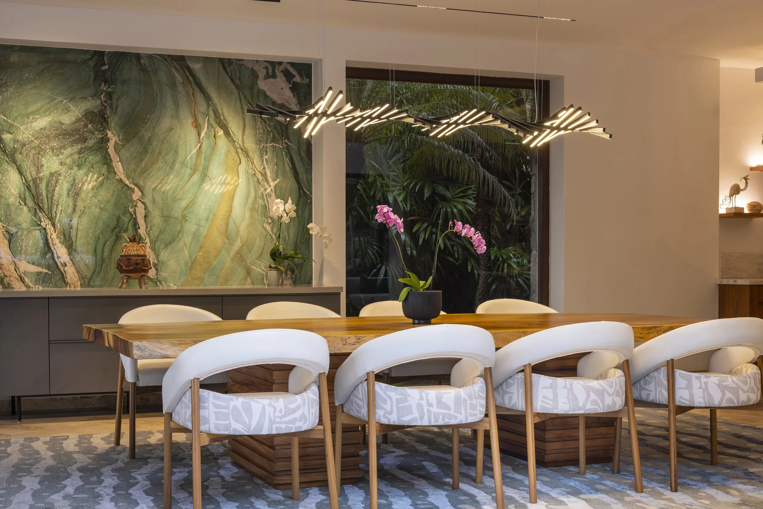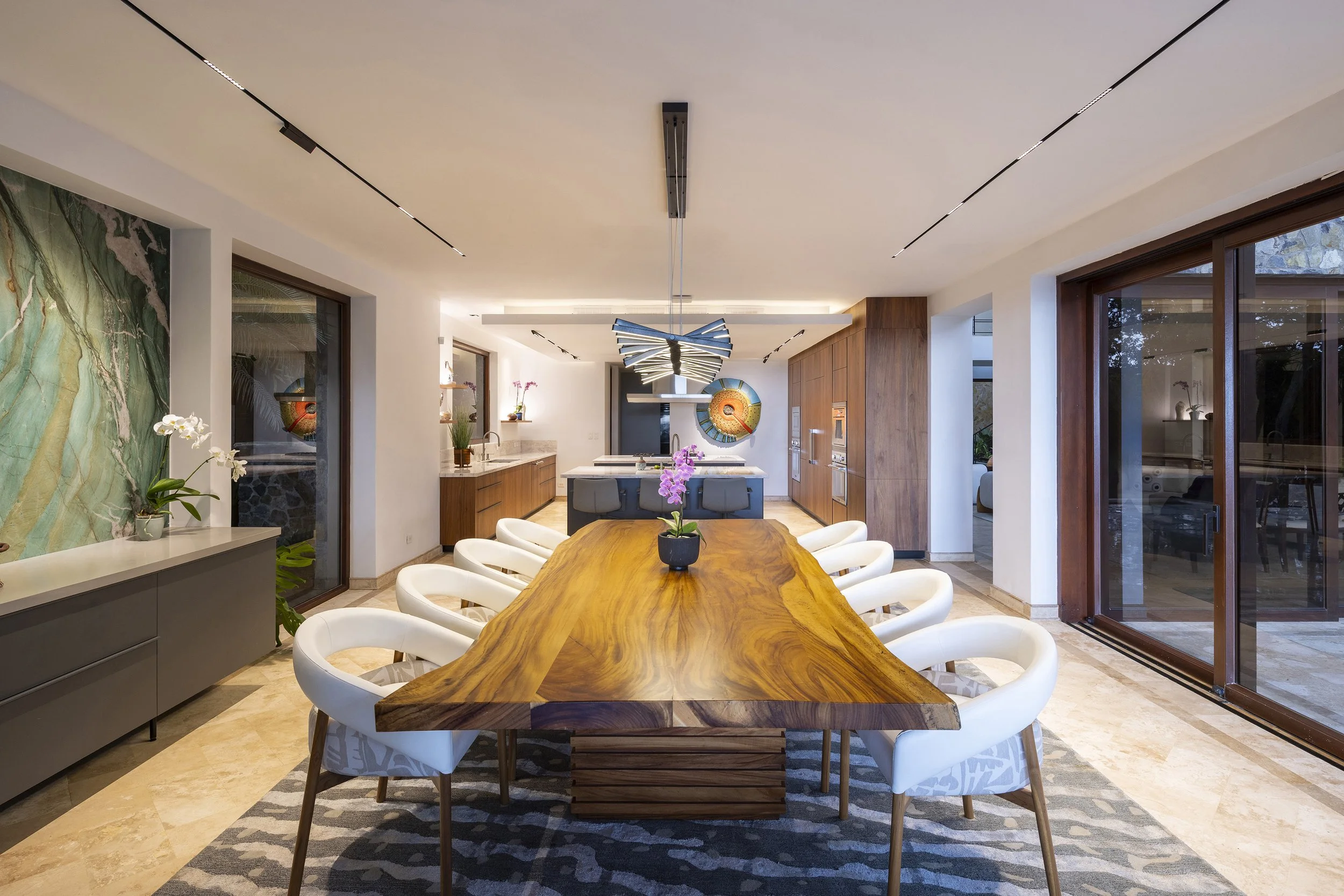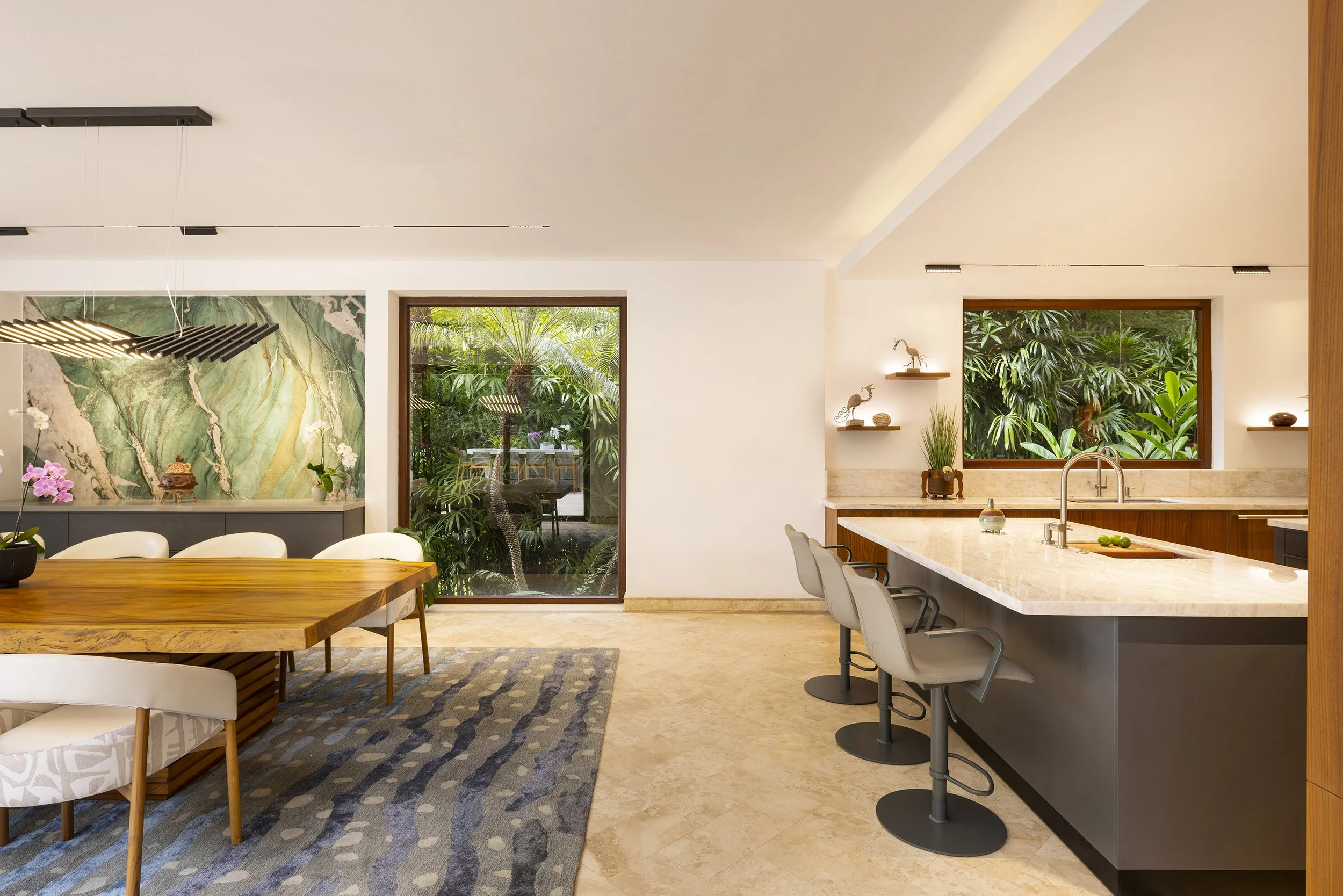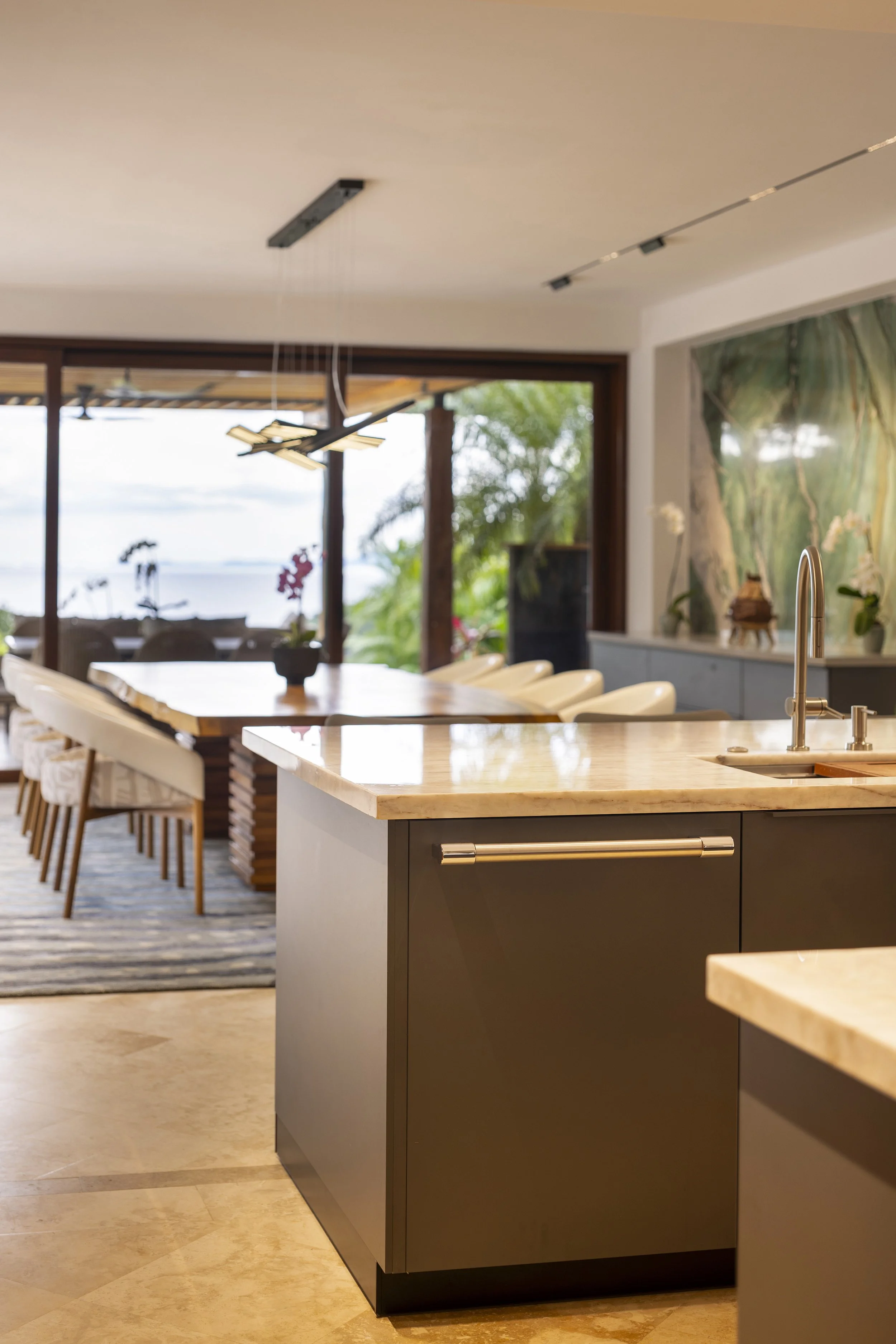 A large quartzite slab in green and turquoise hues echoes the sea while connecting visually to the kitchen. Lighting was redesigned to introduce layered atmospheres, extending from the kitchen ceiling to the terrace and allowing subtle variations in mood that respond both to the moment and to the surroundings.