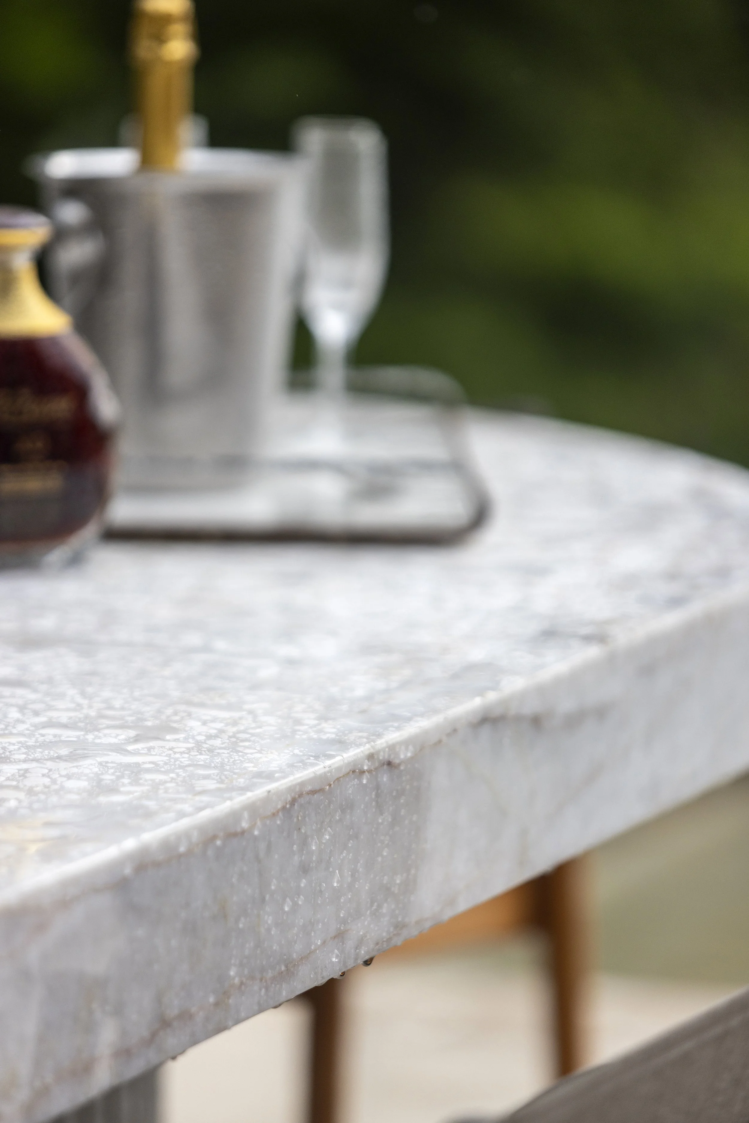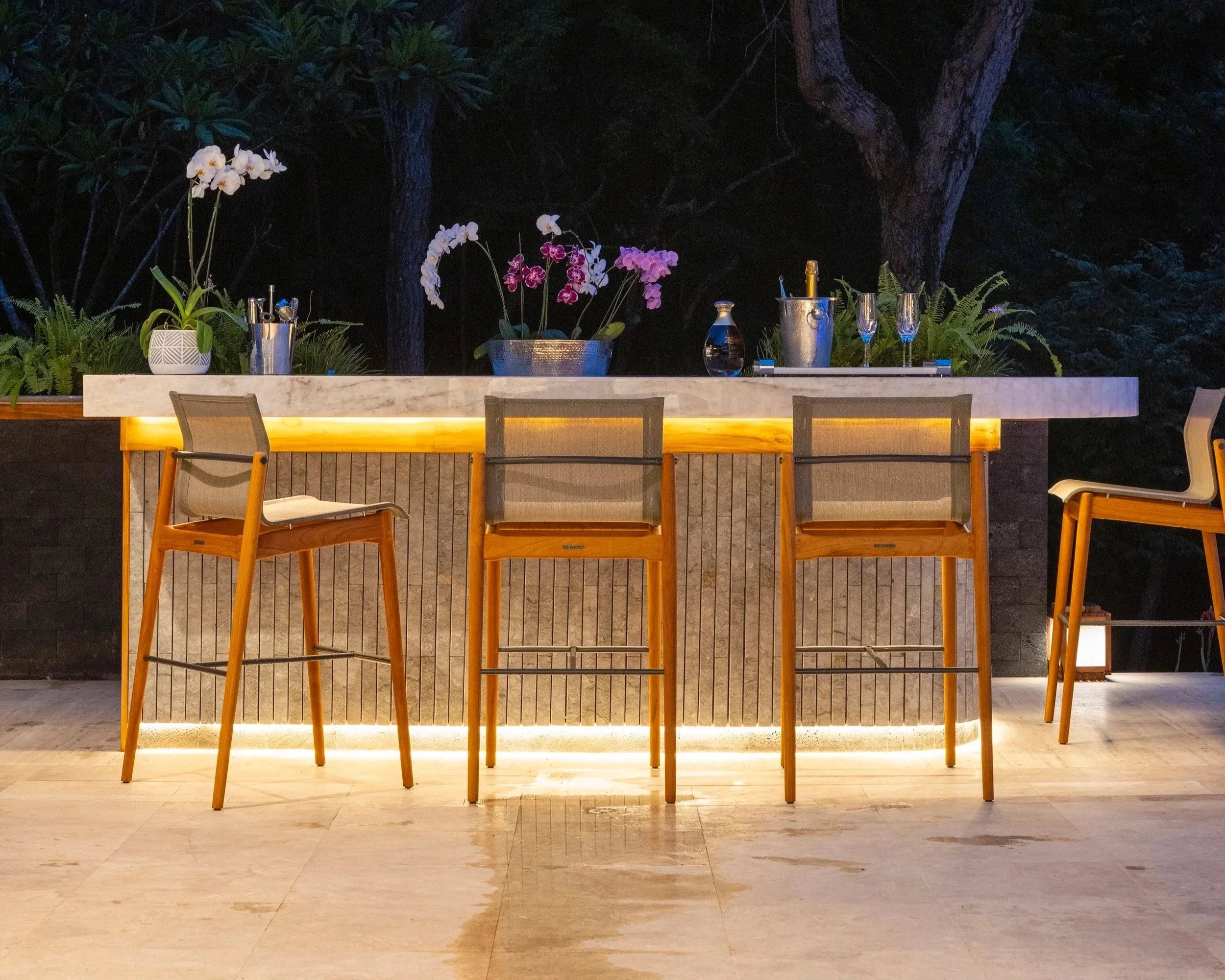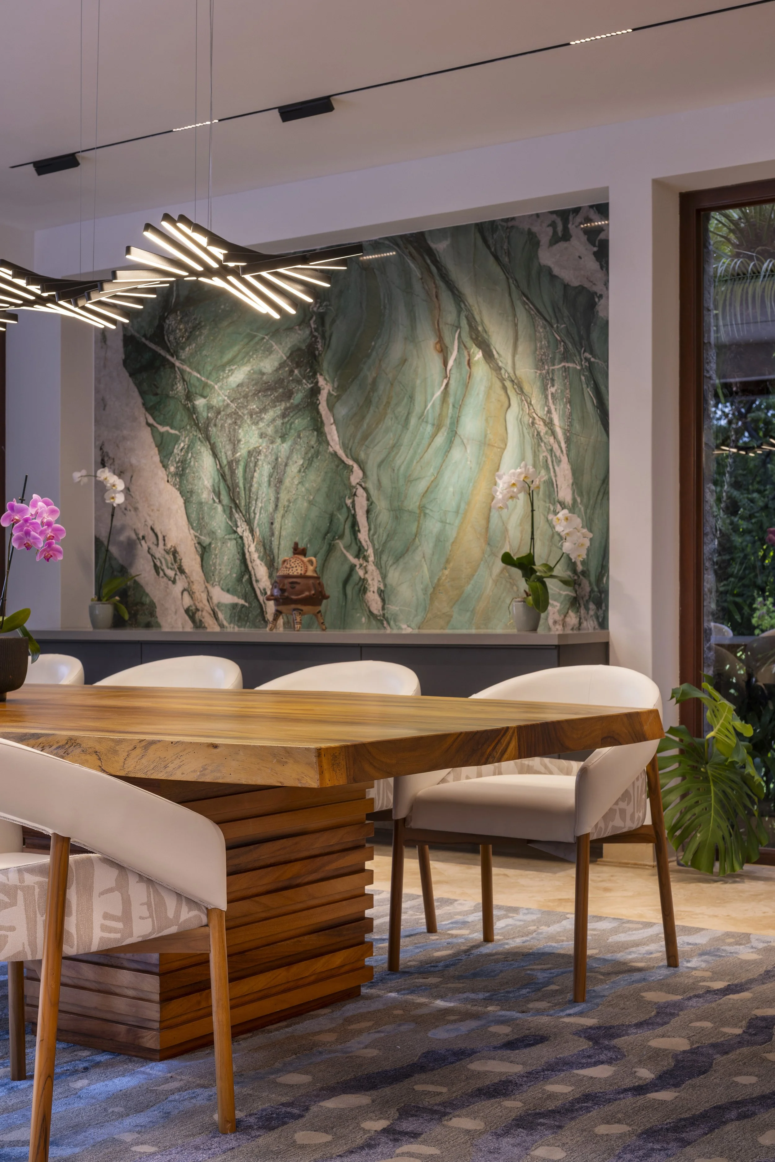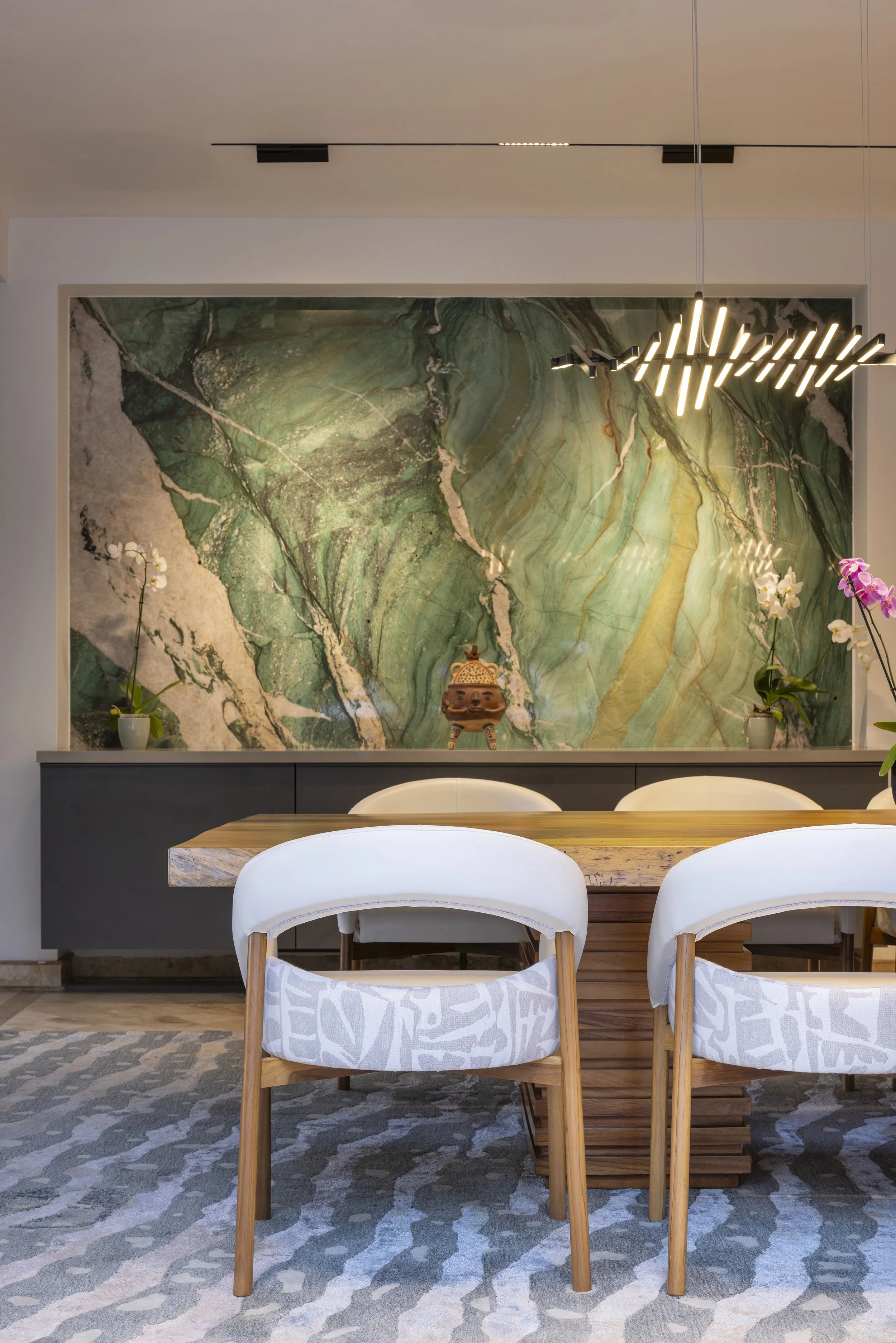 A large quartzite slab in green and turquoise hues echoes the sea while connecting visually to the kitchen. Lighting was redesigned to introduce layered atmospheres, extending from the kitchen ceiling to the terrace and allowing subtle variations in mood that respond both to the moment and to the surroundings.