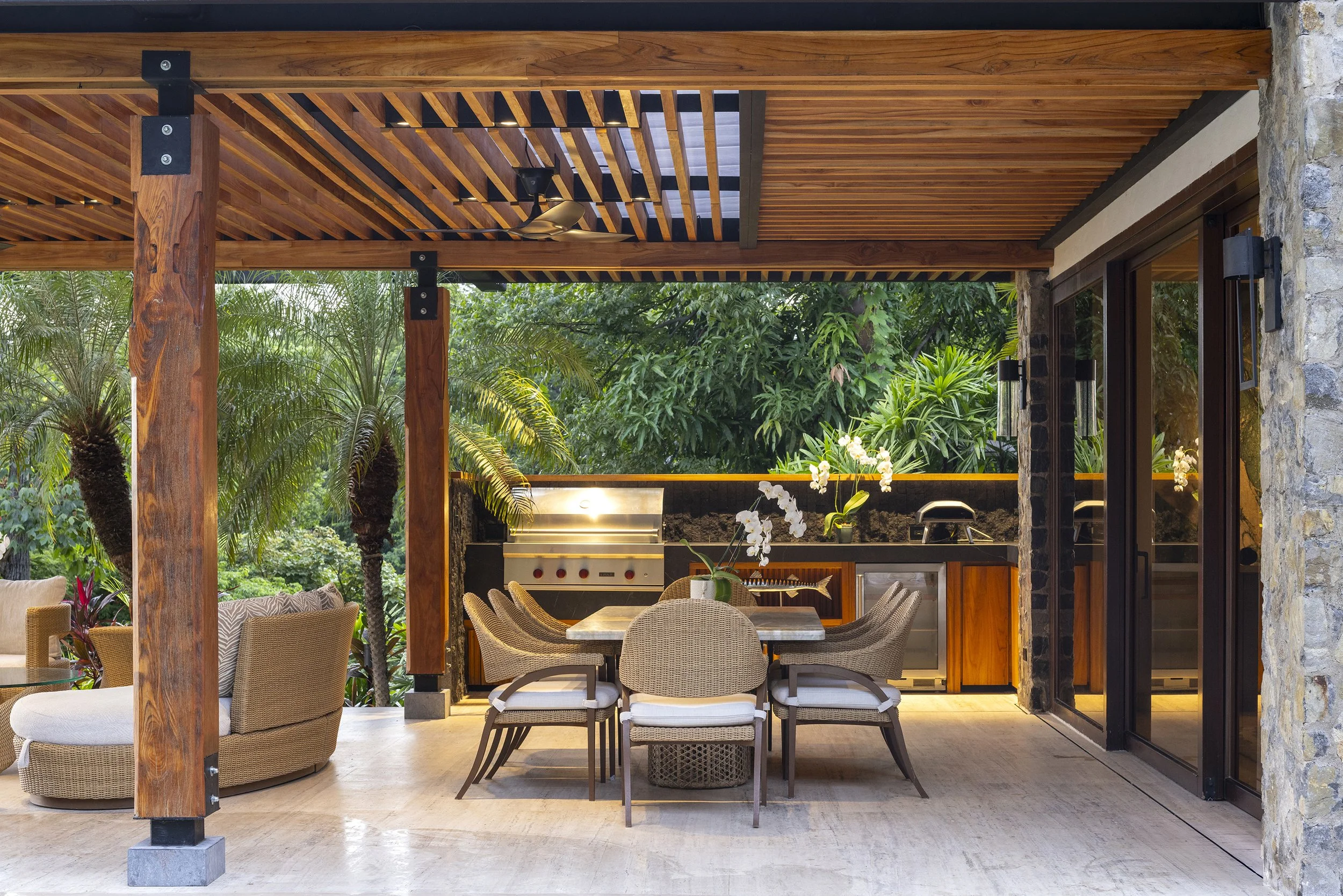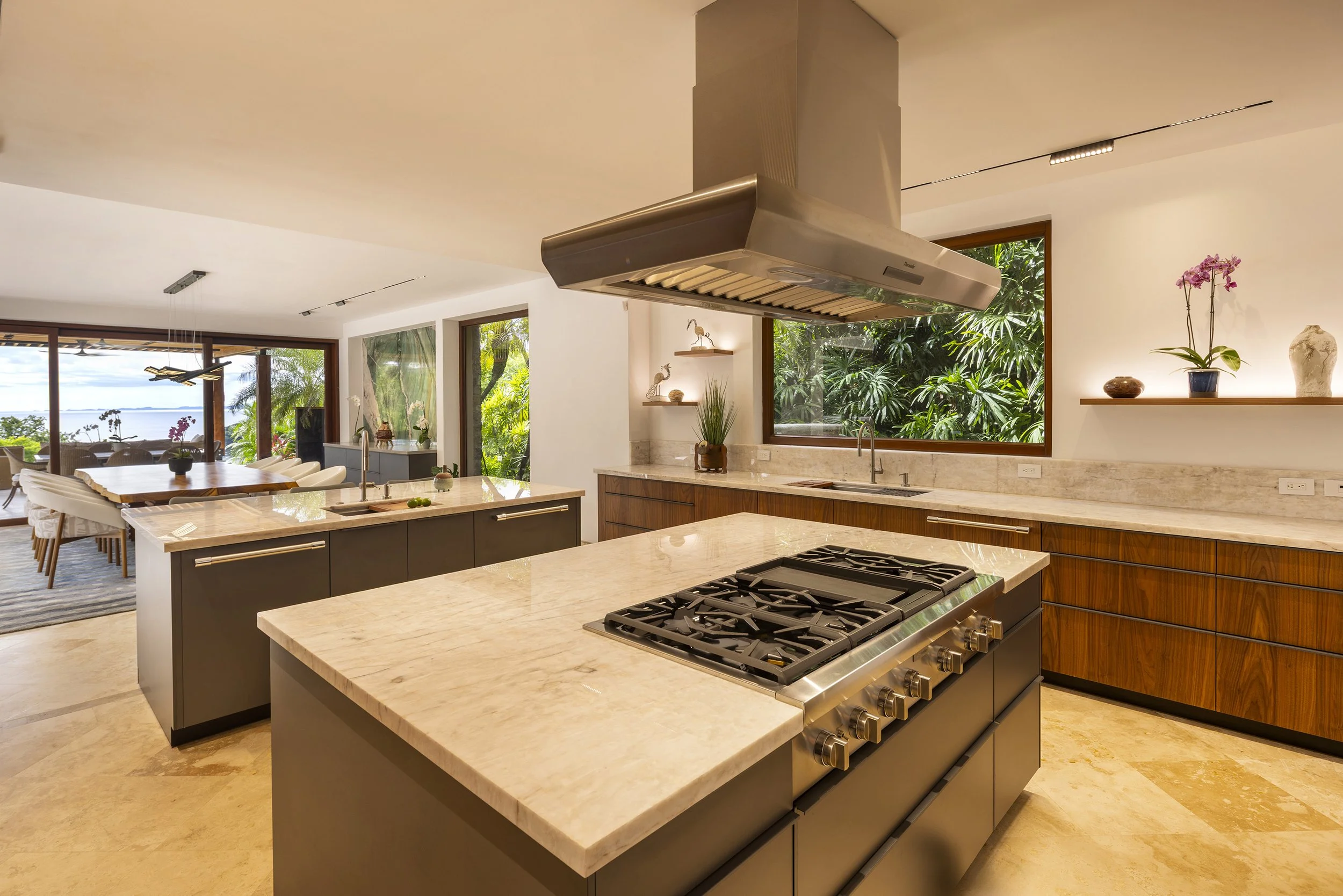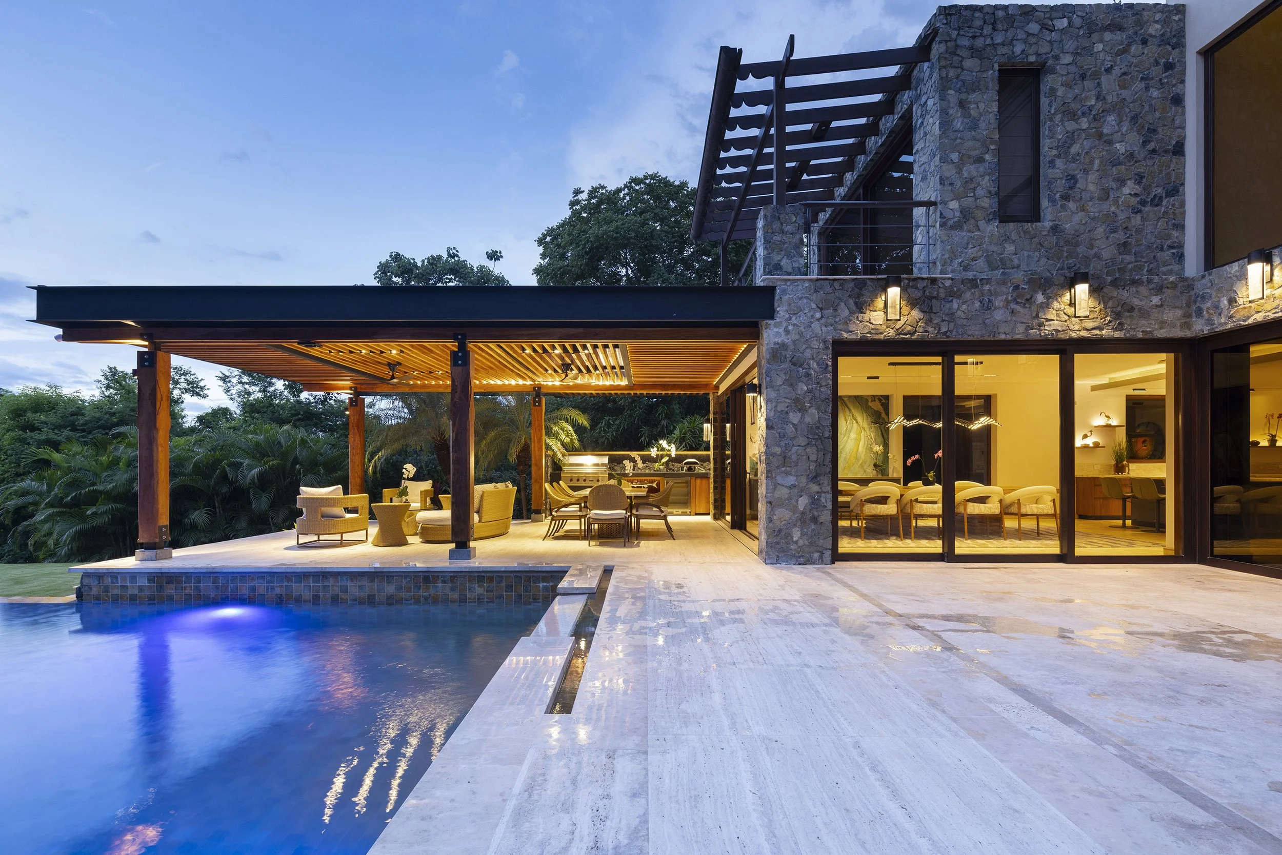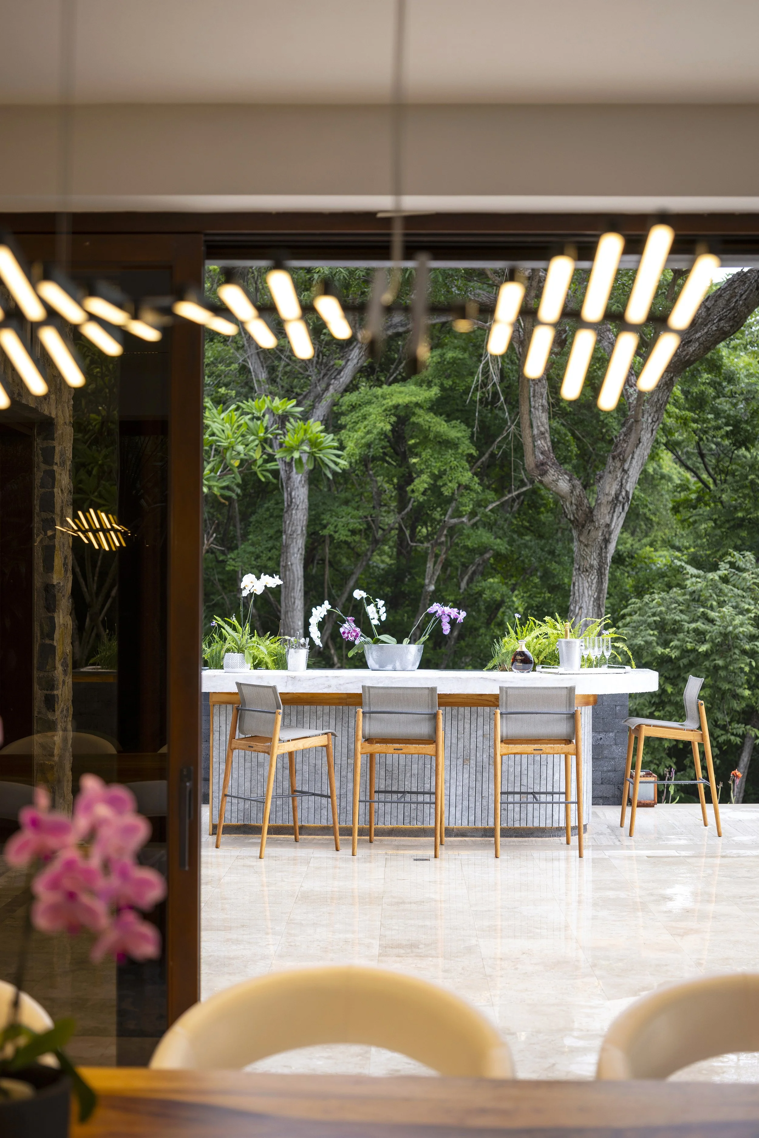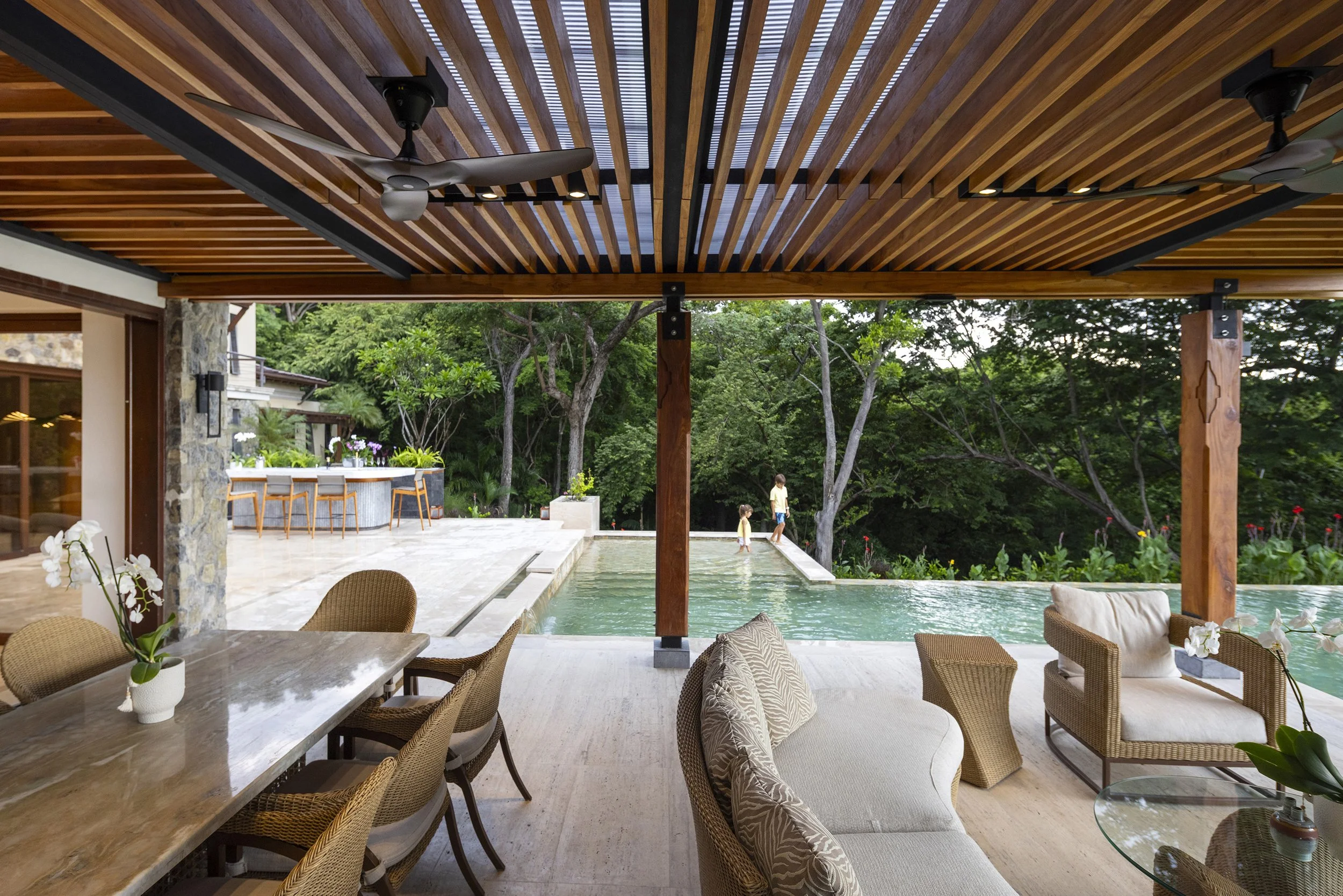 Designed by Abraham Valenzuela, the house settles gently into the topography, framing spectacular views toward the beach while giving hierarchy to its surroundings. It becomes a refuge of peace and silence within nature—a place where sunsets are accompanied by the distant sound of monkeys moving through the trees