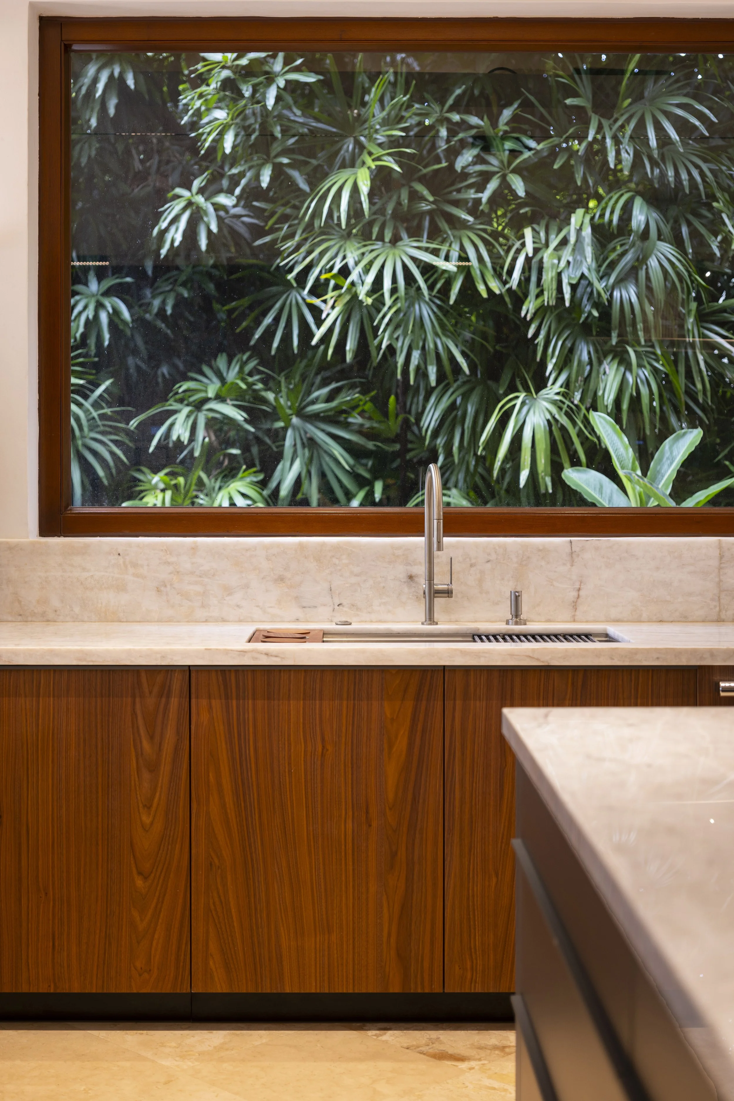 This emptiness creates space for a large window that introduces the surrounding nature into the interior—a living canvas of organic forms that change with time, light, and season