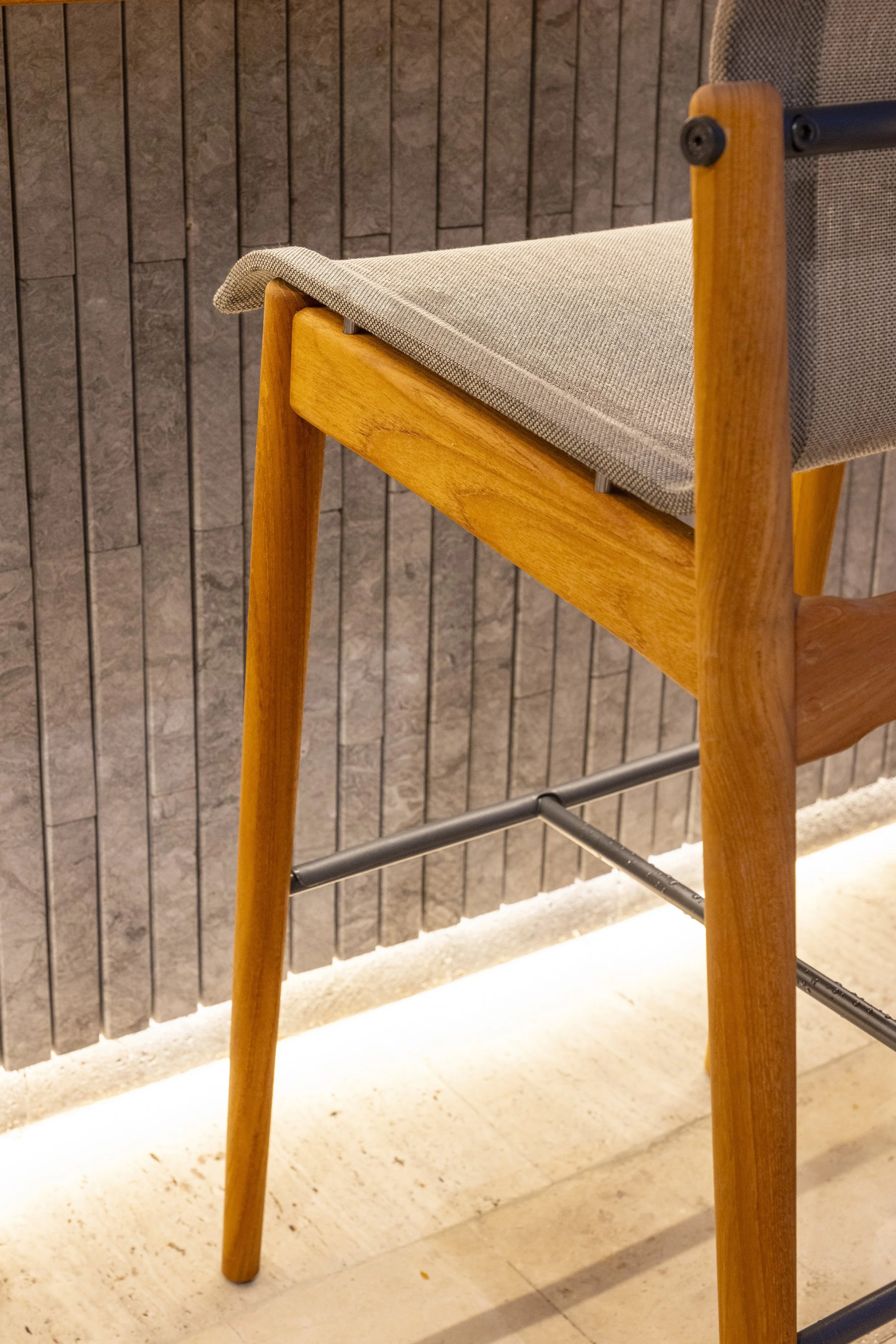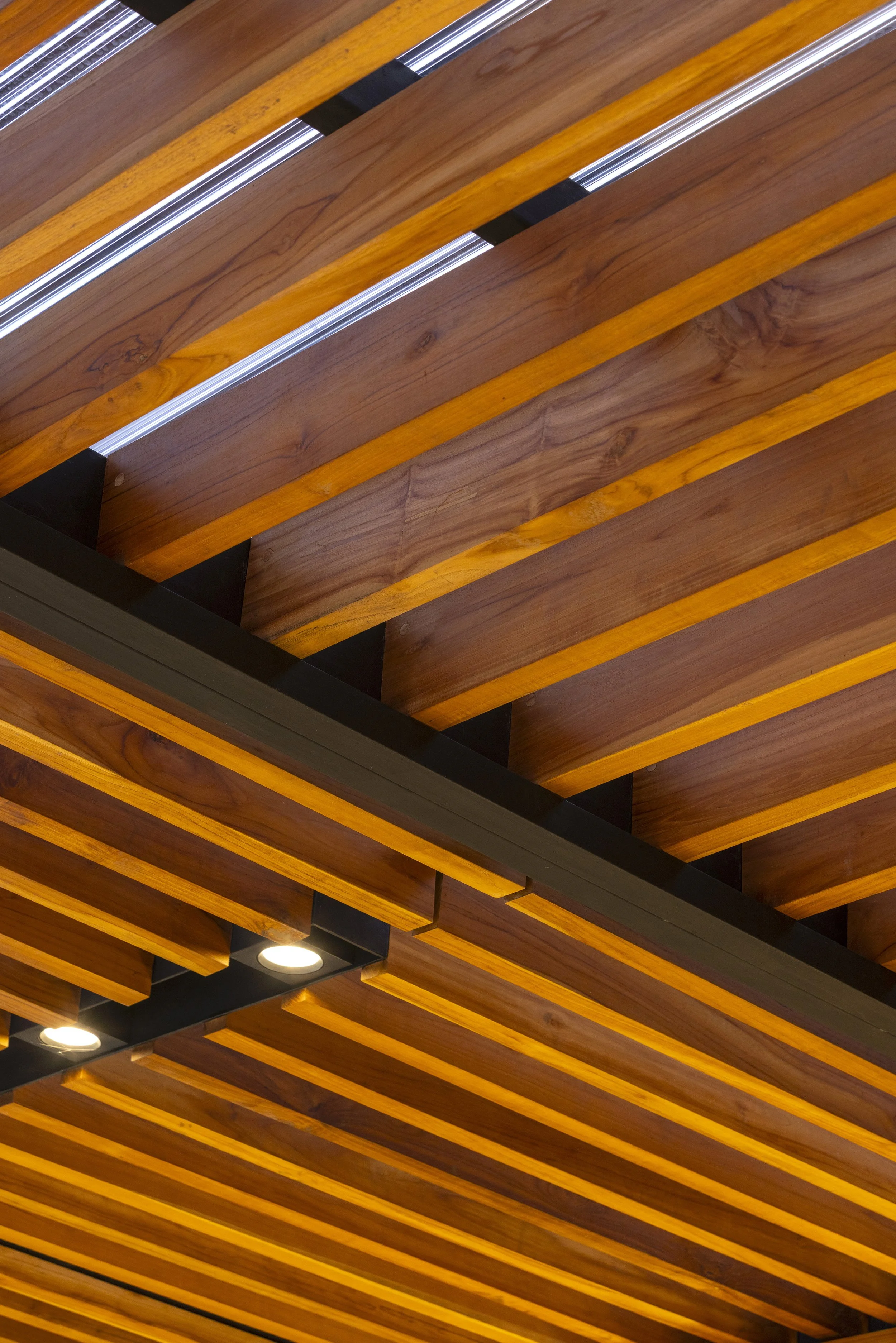 The same detail is adapted at the upper connections, where the metal elements support the new teak ceiling. Here, the connectors are rotated to counteract torsional forces generated by the structure’s own weight, ensuring both stability and elegance.