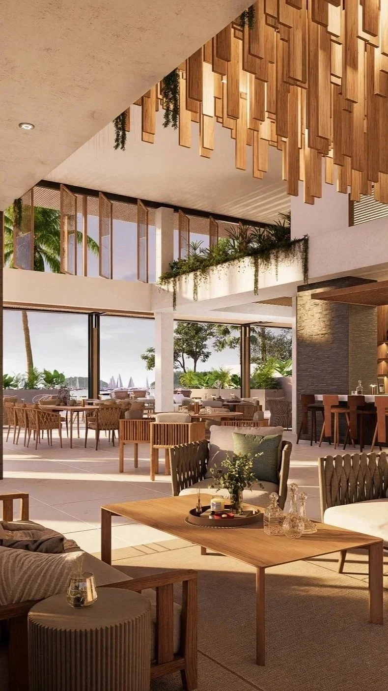Pivoting wooden louvers filter the sea breeze and daylight, while planters and suspended vegetation create a soft sense of enclosure and scale within the double-height dining space. A firm yet fragmented concrete structure supports the open plan, freeing long spans that frame uninterrupted views of the ocean.