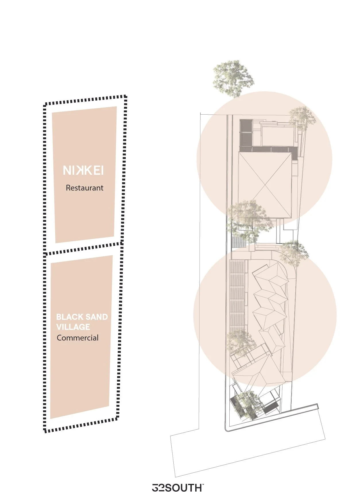 A sequence of small-scale commercial spaces leads to a plaza that connects the street to the beach, culminating in a restaurant that celebrates shade, vegetation, and sea breeze.